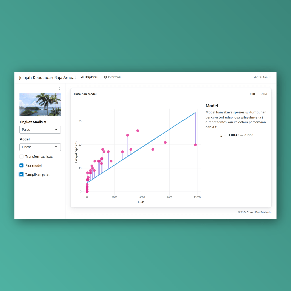Aktivitas pembelajaran interaktif ini mengajak untuk menjelajah Kepulauan Raja Ampat dengan menggunakan berbagai macam fungsi. Melalui aktivitas ini, kamu akan melihat bagaimana pemanfaatan fungsi untuk memodelkan banyaknya spesies terhadap luas wilayahnya. Ayo buka aktivitas ini!