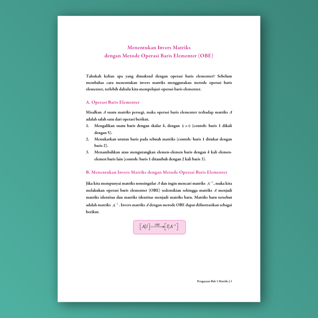 Ayo perkaya kemampuan kalian dalam materi Matriks dengan membuka materi pengayaan ini! Materi ini menunjukkan bagaimana menentukan invers sebuah matriks dengan operasi baris elementer.