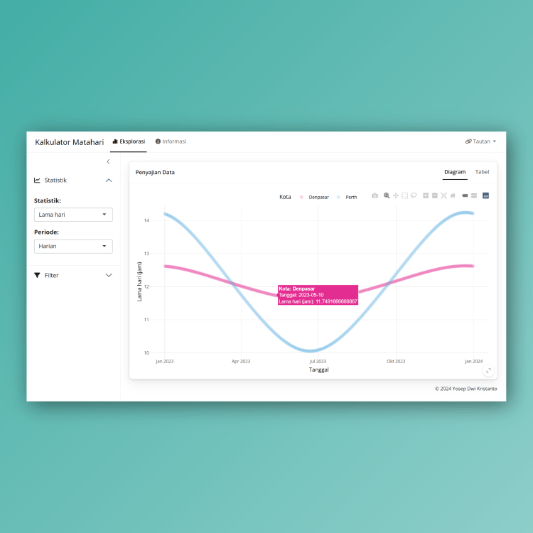 Dasbor Shiny ini bertujuan untuk memvisualisasikan data tentang matahari. Misalnya, Anda dapat melihat dan membandingkan lamanya hari antara dua kota setiap waktunya. Anda juga dapat melihat kapan matahari terbit dan terbenam setiap waktunya.