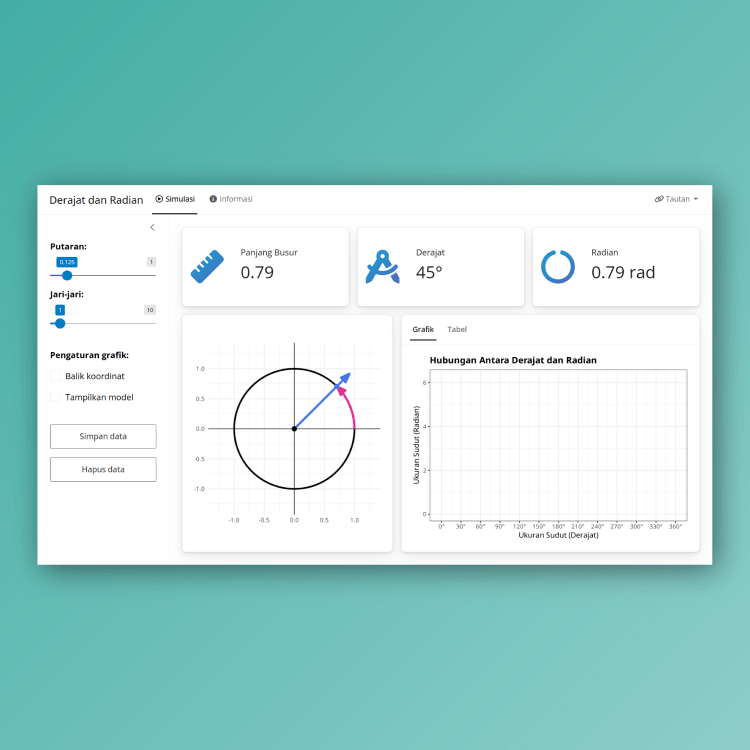 Media pembelajaran interaktif ini dapat digunakan sebagai alternatif untuk memandu murid menyelidiki hubungan antara derajat dan radian. Klik tombol berikut untuk membuka media tersebut!